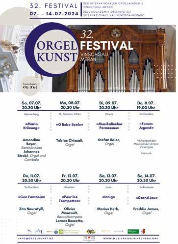 Das 32. Festival der Orgelkunst Vinschgau-Meran findet vom 7. bis 14. Juli 2024 statt. Beeindruckende Orgelkonzerte an verschiedenen historischen Orten im Vinschgau erwarten einem dabei. Tickets kosten 12 Euro (ermäßigt 6 Euro). Für weitere Informationen: www.musicaviva-vinschgau.org oder per E-Mail an info@orgelkunst.bz.