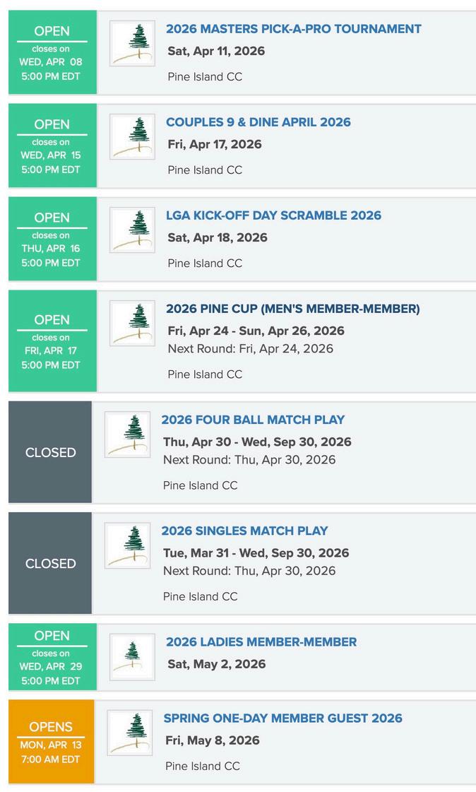 April is also about connection and community. Our New Member Mixer is the perfect opportunity to meet new faces and strengthen friendships, while Couples 9 & Dine brings a fun blend of golf and dining, ideal for a relaxed and memorable date night For a little "friendly" competition, the Pine Cup is sure to bring excitement to the month.