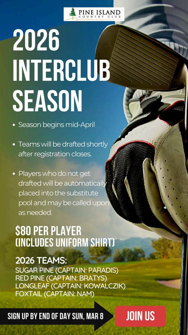 Over the past 12 months, I have been committed to listening and learning how things are done at Pine Island. With nearly 60 years of history, the traditions and culture of this Club have been thoughtfully built over time Along the way, we have implemented several operational and even cultural changes that I hope have strengthened your experience and confidence in the Club’s future