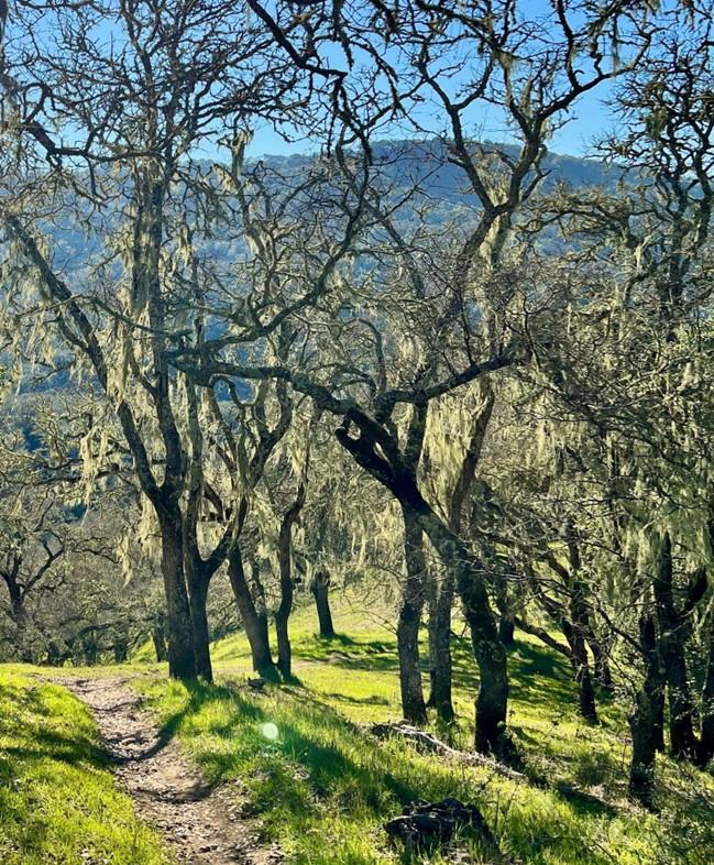 Iwalk along Steer Ridge and up Willson Peak between the oaks and over the serpentinite, marveling at the long, peaceful views of distant hills and peaks all around me. When it’s finally time to head back down off the ridge, I look forward to yet another sight that never fails to delight me – the brightgreen nets of lace lichen (Ramalina menziesii) festooning the blue oaks on the lower slopes towards Hunting Hollow. And what an odd delight this stuff is – it’s not a plant, yet it photosynthesizes. It attaches firmly to trees, but derives no nutrients from them. It soaks up water readily, but only from what’s in the air. It’s also a symbol of the State of California – lace lichen is our official state lichen, signed into law by Governor Jerry Brown in 2015 after a years-long campaign of support by the California Lichen Society.