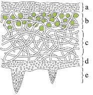 loosely woven hyphae that includes trapped algal cells (layer b, called the photobiont layer, and layer c, loosely woven hyphae). Layer e shows the specialized hyphae that attach the lichen to a substrate.
