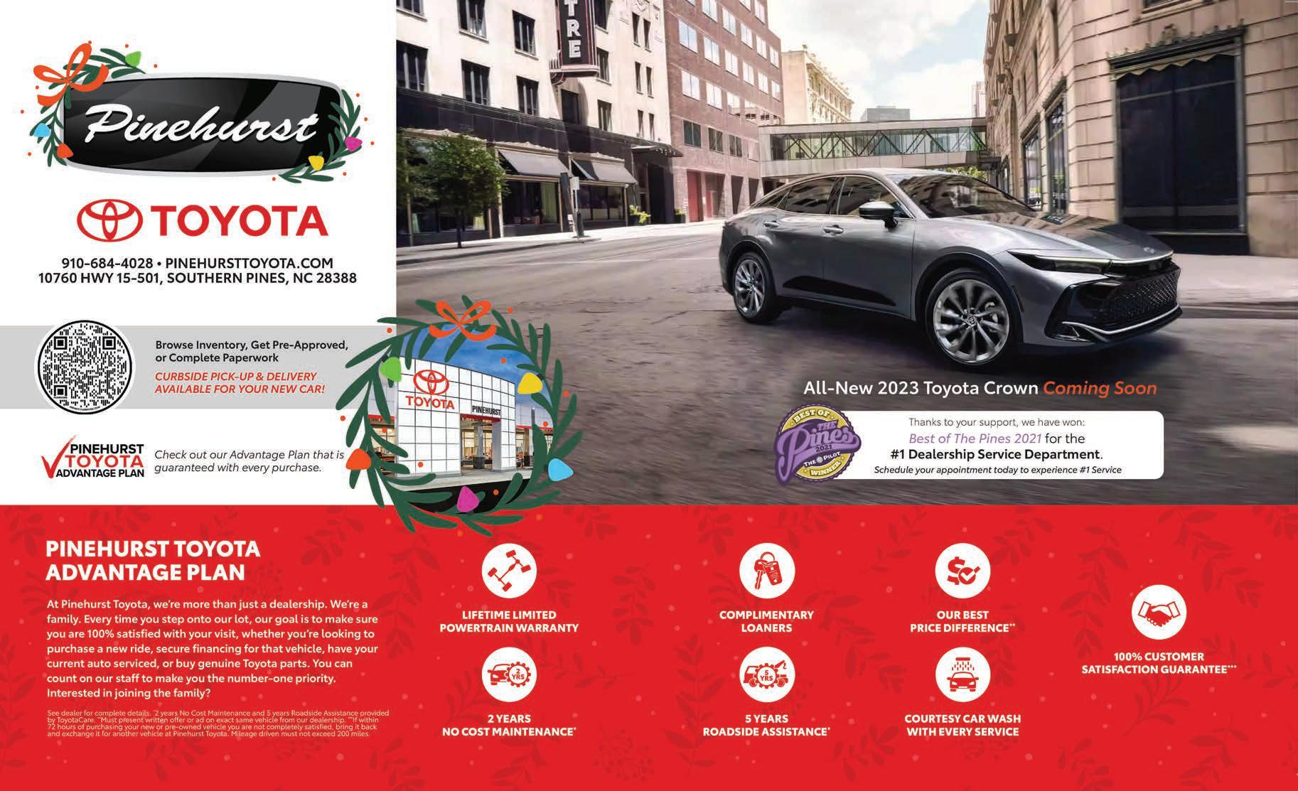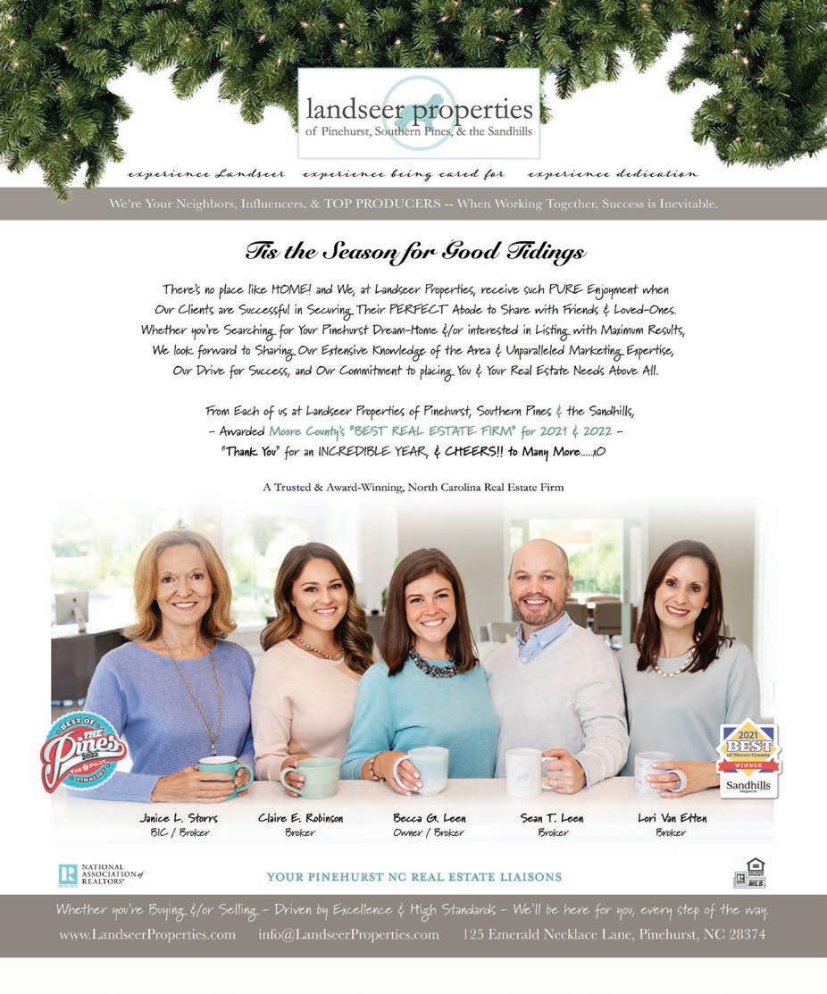 hwwebster@embarqmail.com Thank you for Voting Us Best Farmers Market www.KellerWilliamsPinehurst.com | 910-692-5553 “Each office is independently owned and operated” The holiday season can be stressful, finding a real estate agent to help you buy or sell a home shouldn’t be. Give Keller Williams Pinehurst, the #1 real estate firm in Moore County, a call today! Save the Date in 2023! Thursday, May 25th Fairbarn • 6-10pm www.duskinandstephens.org bookamassagebykathleen.com 150 N Bennett Street, Southern Pines • (910) 691-1669 BLISSFUL BODYWORK AND SKINCARE bestofthepines.com 132 Westgate Dr. West End, NC 27376 910.235.0606 THANK YOU TO OUR AMAZING CUSTOMERS! SUSHI, ASIAN CUISINE – AND –HIBACHI MON - FRI LUNCH 11AM - 2:30PM MON - THU DINNER 3PM - 9PM FRI DINNER 3PM - 10PM SAT 3PM - 10PM SUN 11AM - 9PM ALL DINNER 190 BRUCEWOOD RD | SOUTHERN PINES | 910-246-2106 VISIT DOORDASH.COM FOR MENU BEST JAPANESE/ HIBACHI RESTAURANT 285 SE Broad St Suite B, Southern Pines, NC 28387 (910) 692-2731 • www.kirbycompanies.com WE ARE HONORED TO BE VOTED MOORE COUNTY’S BEST HOME BUILDER THREE YEARS IN A ROW! Top Home Inspector in Best Of The Pines Two Years in a Row A multi inspector company Veteran Owned & Operated 910-606-3033 Request an Inspection Today