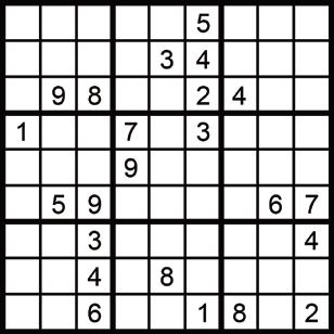 Sudoku: Fill in the grid so every row, every column and every 3x3 box contain the numbers 1-9.
