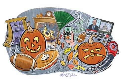 Halloween, of course, is the grand finale of October’s comforts. What’s scary is how much money Americans shell out annually on costumes, candy and creepy, inflated yard decorations (something like $11.6 billion last year, according to LendingTree), which suggests to me that being happily frightened by the sight of lighted ghouls on the lawn and kids who come in search of candy dressed as the walking dead is simply a welcome break from the daily horrors of cable news.