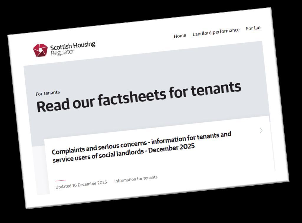The factsheet also outlines the steps tenants must take before contacting the SHR, including completing the landlord’s complaints procedure and, if necessary, approaching the Scottish Public Services Ombudsman (SPSO).