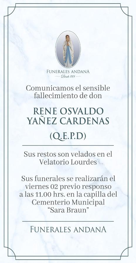 Sus funerales se realizarán el día jueves 01 de mayo del 2025, previo oficio religioso a las 14.00 horas en el centro ceremonial dicho parque, para posteriormente dirigirse al Cementerio Municipal.