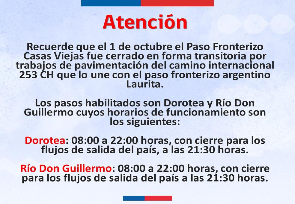En tal sentido, los pasos que se encontrarán habilitados para ir o retornar desde el territorio transandino son los de Dorotea y el del Río Don Guillermo. Es por esta razón que desde la Delegación Presidencial Provincial anuncian detalladamente, los horarios de funcionamiento de los mismos, a fin de que las personas puedan tomar previsiones a la hora de ir o retornar al país vecino. De esta forma se conoce que los horarios de apertura y cierre tanto para salir como para ingresar a Chile son los mismos en ambos puestos de control. Desde las 8.00 horas de la mañana comenzará el cruce y las labores de fiscalización en lo que concierne a aduanas y control de documenta -