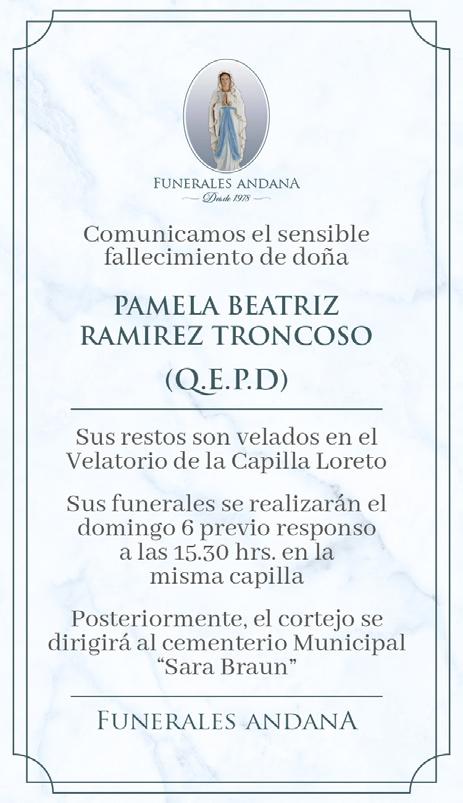 Con profundo pesar se comunica el sensible fallecimiento de Pamela Beatriz Ramírez Troncoso (Q.E.P.D.), cuya vida fue reflejo de entrega, bondad y alegría. Sus restos son velados en la Capilla Nuestra Señora de Loreto, donde amigos, familiares y seres queridos se congregan para rendirle homenaje, compartir recuerdos, y acompañarla en su despedida con amor y respeto. Sus funerales se realizarán hoy domingo 6, después de un oficio religioso a las 15:30 horas. Posteriormente se dirigirá hacia el Cementerio Municipal Sara Braun. Participa: su amigo Gerardo Pérez, quien la despide con sincera gratitud por los momentos compartidos, su incondicional amistad y la luz que supo entregar en vida.