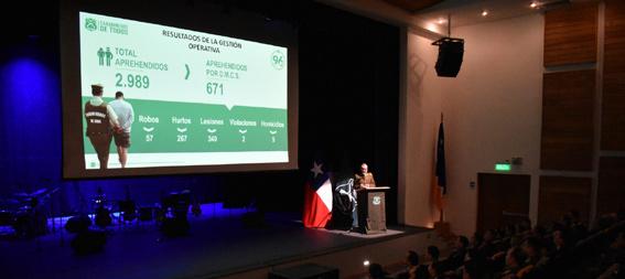 Asimismo, se refirió a las cifras positivas que dan cuenta de la acción institucional realizada por Carabineros durante el pasado año, contabilizándose 2 mil 989 personas aprehendidas, de las cuales 671 obedecieron a delitos de mayor connotación social, prevaleciendo el delito de lesiones con 340 casos.