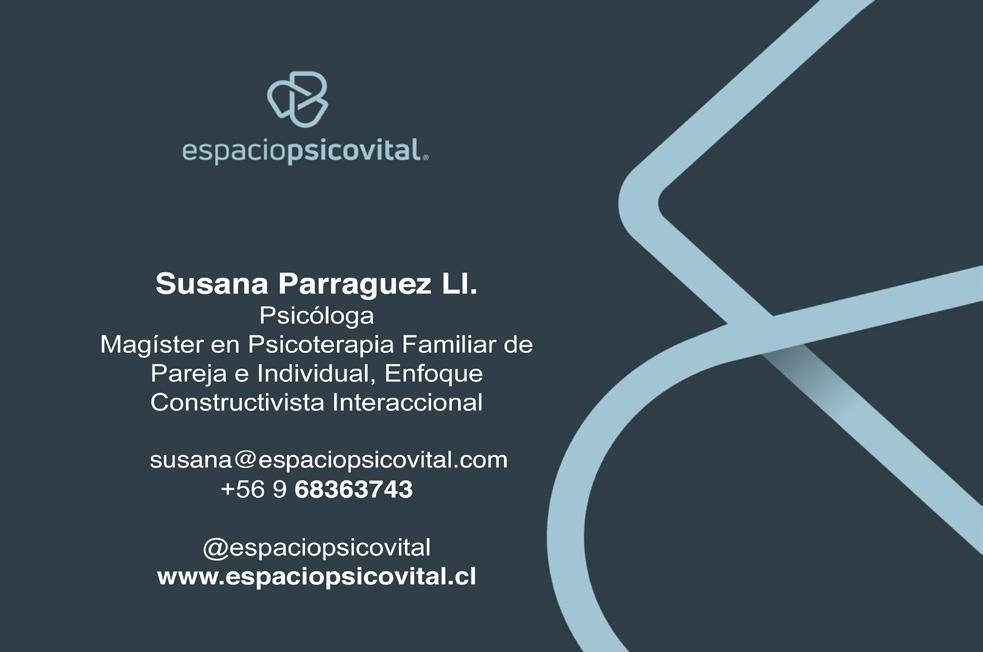 susana Parraguez Ll. psicóloga Magister en Psicoterapia familiar de Pareja e individual. Enfoque Constructivista Interaccional susana@espaciopsicovital.com +56 9 68363743 @espaciopsicovital www.espaciopsicovital.cl