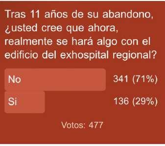 Una encuesta realizada por Pingüino Multimedia, en la cual se le consultaba a la ciudadanía ¿usted cree que ahora, realmente se hará algo con el edificio del exhospital regional? Fueron 477 personas las que participaron en donde el 71% no cree que se haga algo finalmente en aquel lugar y sólo el 29% cree que sí se hará algo finalmente en aquel sitio.