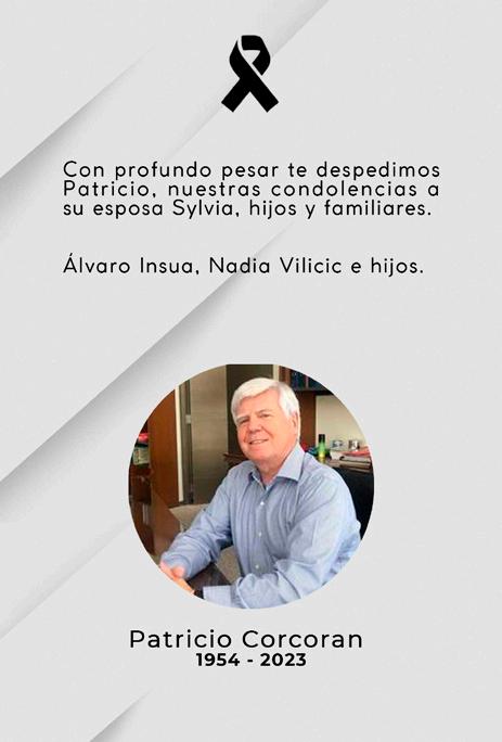 Comunicamos el sensible fallecimiento de nuestro querido amigo, Patricio Corcoran Bahamondez (Q.E.P.D.). Acaecido en la ciudad de Santiago. Participa: Rodrigo Solo de Zaldívar y familia.