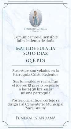 Lamentamos informar el fallecimiento de la señora Matilde Soto Díaz (Q.E.P.D), madre de nuestro colaborador, señor Fabián Aguilar. El velorio se está realizando en la capilla Cristo Redentor (Jorge Montt esquina Club Hípico). Sus funerales efectuarán hoy jueves 15, después de un oficio religioso a las 14:30 horas. Posteriormente se dirigirá hacia el Cementerio Municipal Sara Braun. Participa: Gerencia y colaboradores Sánchez y Sánchez.