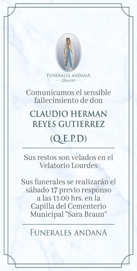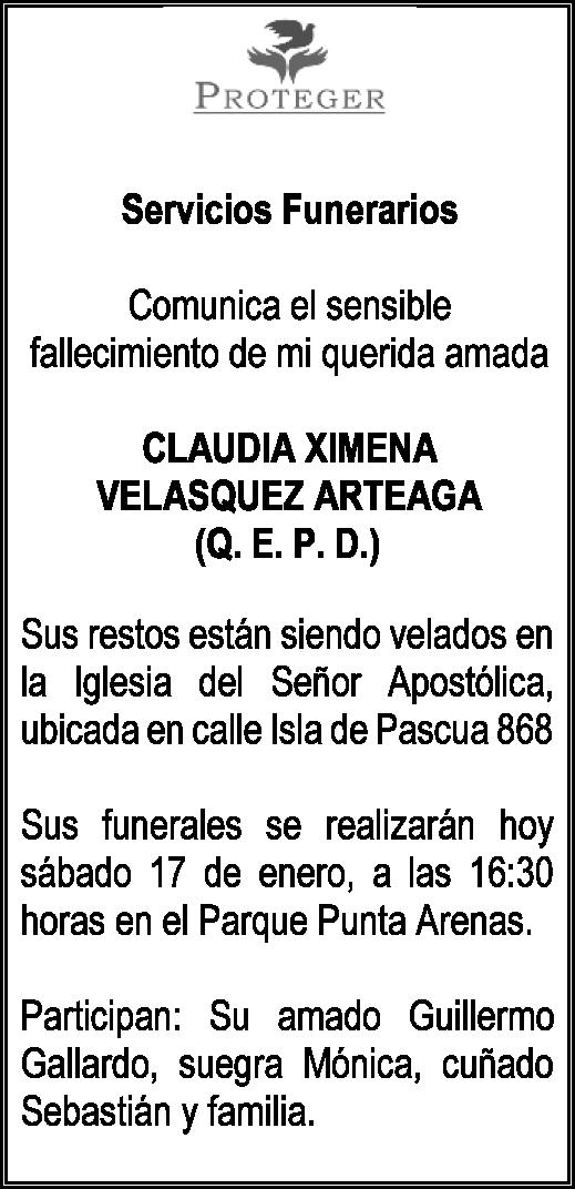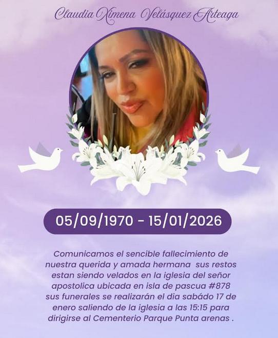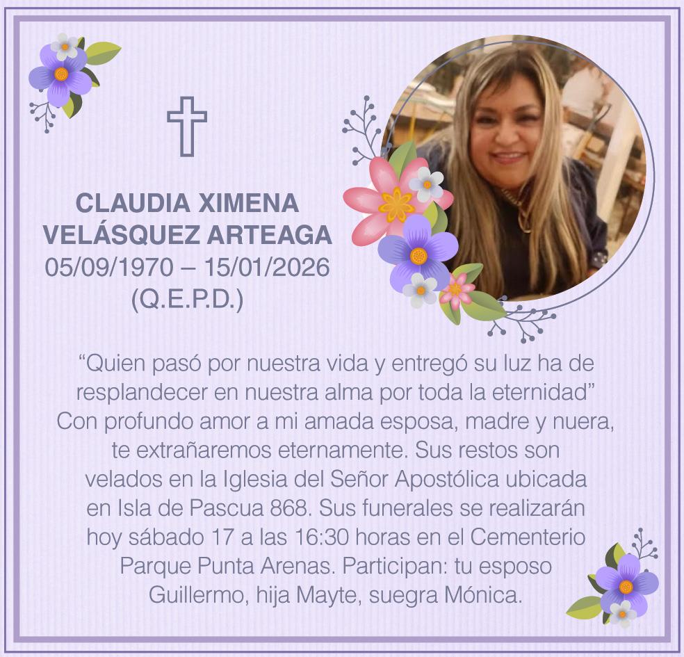Con profundo pesar comunicamos el fallecimiento de nuestra querida amiga y confidente de tantos años, Claudita Ximena Velásquez Arteaga (Q.E.P.D.). Su amistad sincera, su palabra justa y su enorme corazón quedarán por siempre en nuestra memoria. Agradecemos cada momento compartido y el amor que supo entregar sin medida. Sus restos son velados en la Iglesia del Señor Apostólica ubicada en Isla de Pascua 868. Sus funerales se realizarán hoy sábado 17, a las 16:30 horas en el Cementerio Parque Punta Arenas. Acompañamos con mucho cariño a su familia y seres queridos en este momento tan doloroso. Descansa en paz, querida gordita, tu luz y tu recuerdo vivirán siempre en nosotros. Participan: tus amigas que te recordarán por siempre, Marisol, Ivania y Paola.