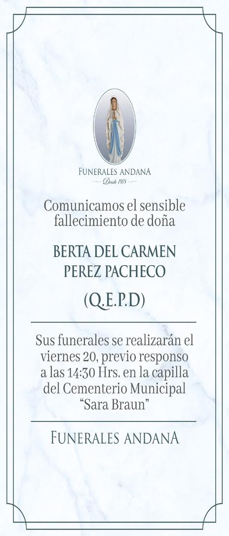 Sus restos son velados en el velatorio Lourdes. Sus funerales se efectuarán hoy jueves, previo responso a las 15:00 horas en la misma fracción del Cementerio Parque Cruz de Froward. Participa: su hermana Lida y amigo Alberto.