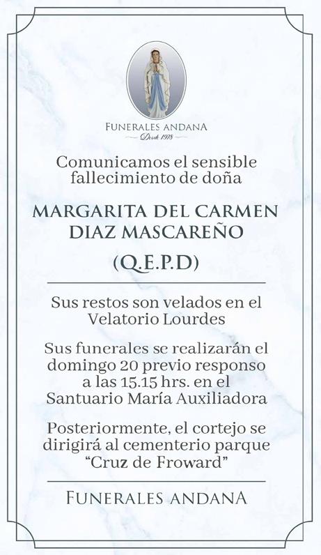 Se participa el fallecimiento en la región de Los Lagos de doña, Mariana Elisa Muñoz Cochifas (Q.E.P.D.). Su velatorio y funeral se realizarán en la ciudad de Puerto Montt en día y hora a confirmar. Participa: Oreste Muñoz hija Carolina y nieta Sofia