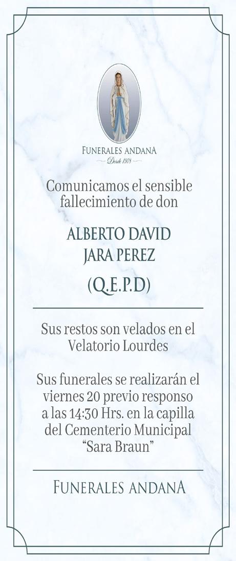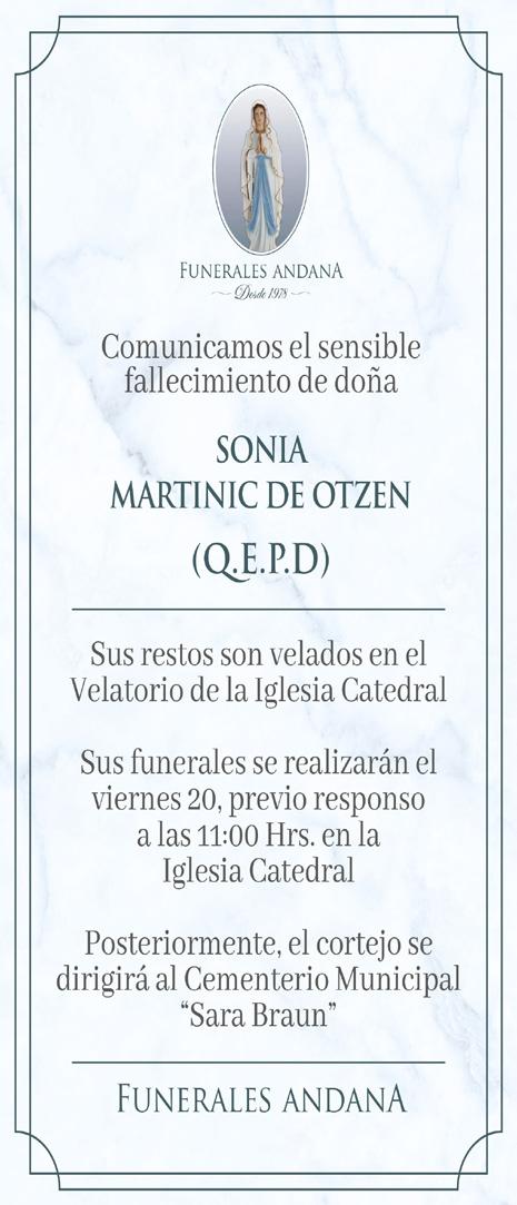 Con profundo pesar, comunicamos el sensible fallecimiento de la señora Sonia Martinic Bahamóndez de Otzen (Q.E.P.D). Sus restos son velados en el velatorio de la Iglesia Catedral. Sus funerales se realizarán hoy viernes 20, previo oficio religioso a las 11:00 horas. Posteriormente se dirigirá hacia el Cementerio Municipal Sara Braun. Dale Señor a su alma el eterno descanso y que su recuerdo permanezca en el corazón de todos quienes fueron parte de su vida. Participa: Jorge Martinic Ruzic y familia.