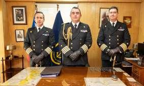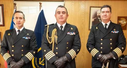 Capitán de Navío Litoral Francisco Arias, gobernador marítimo entrante; capitán de Navío Rodrigo Pérez, comandante en jefe de la Tercera Zona Naval (s); capitán de Navío Litoral Felipe Gonzalez, gobernador marítimo saliente. cedida