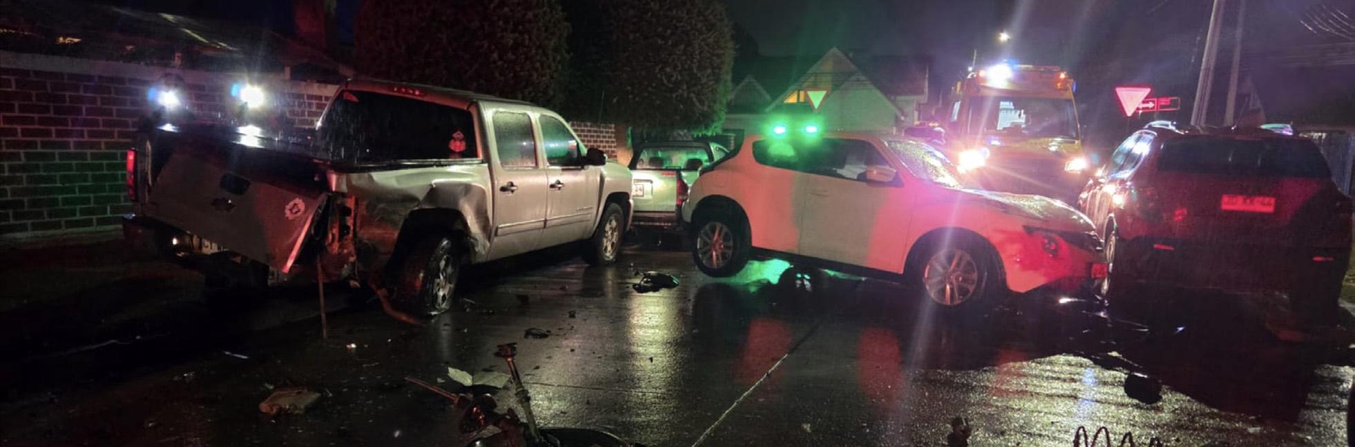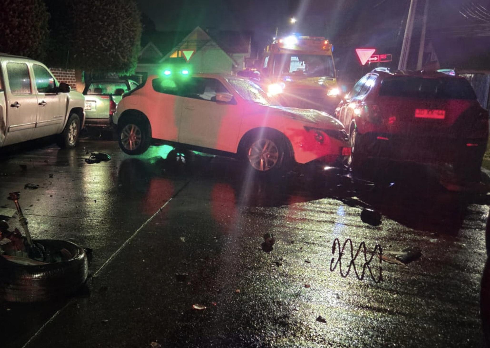 Un conductor ebrio de 65 años impactó anoche a tres vehículos estacionados en el pasaje Baeriswyl entre José González y Enrique Abello de Punta Arenas. Bomberos, SAMU y Carabineros trabajaron en el rescate del chofer quefue asistido por SAMU y derivado al centro asistencial.
