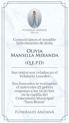 Se comunica el sensible fallecimiento de mi querida hermana, Olivia Mansilla Miranda (Q.E.P.D.). Sus restos están siendo velados en el velatorio de Funerales Andana, ubicado en calle Armando Sanhueza N°298 esquina Maipú. Sus funerales se efectuarán el día miércoles 23 a las 14:00 horas en el cementerio municipal Sara Braun. Lo participan: sus hermanos Norma Mansilla Miranda y Carlos Mansilla Miranda.