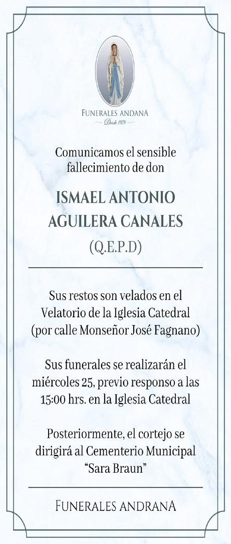 Con profundo pesar comunicamos el sensible fallecimiento de nuestro camarada de armas, SOM ® de Ejército, don Ismael Antonio Aguilera Canales (Q.E.P.D.). Sus restos están siendo velados en el velatorio de la iglesia Catedral, por calle Fagnano. Sus funerales se efectuarán el día miércoles 25, después de un responso a las 15:00 horas. Posteriormente se dirigirá hacia el Cementerio Municipal Sara Braun. Participa: Círculo de suboficiales mayores y suboficiales (R) de Ejército