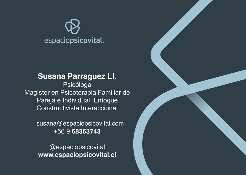 susana Parraguez Ll. psicóloga Magister en Psicoterapia familiar de Pareja e individual. Enfoque Constructivista Interaccional susana@espaciopsicovital.com +56 9 68363743 @espaciopsicovital www.espaciopsicovital.cl