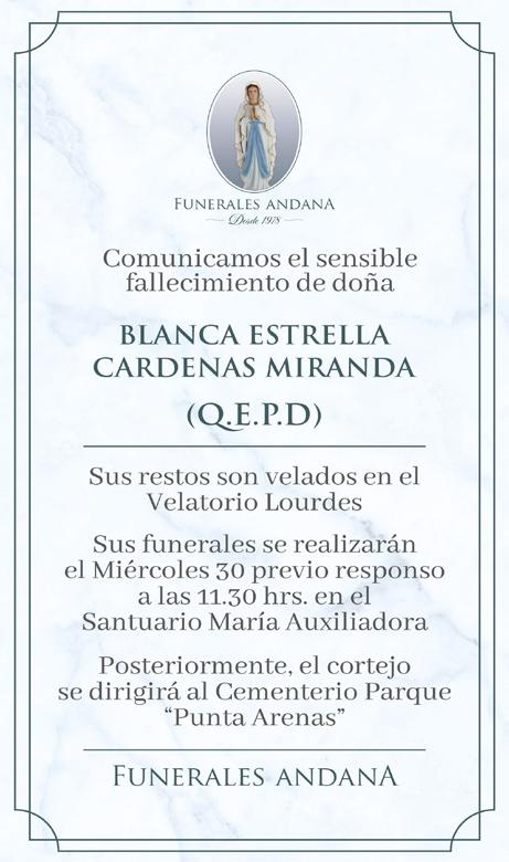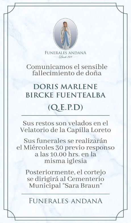 María Berlinda Ulloa Paredes (Q.E.P.D.). Sus restos están siendo velados en salón velatorio de Funeraria Corazón de Jesús, ubicada en Armando Sanhueza 556 (al lado Club Chile). Sus funerales se realizarán hoy miércoles 30 de julio a las 14:30 horas en Cementerio Municipal Sara Braun. Participa: esposo e hijas y familia.
