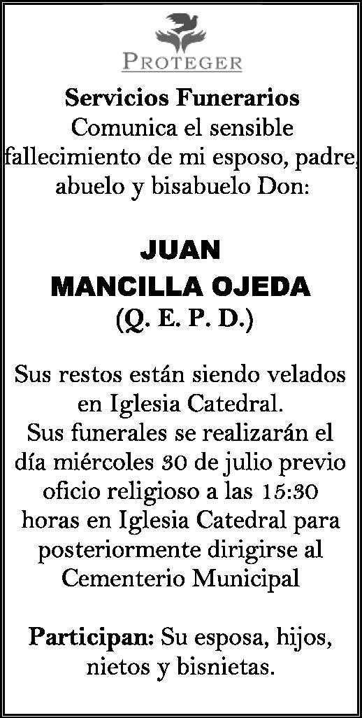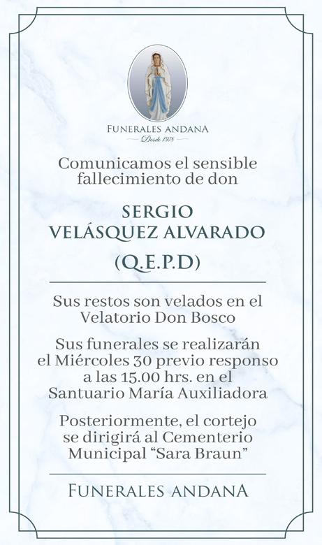 Funeraria Corazón de Jesús, comunica el sensible fallecimiento del señor Raúl Javier Benavides Velásquez (Q.E.P.D.). Sus restos están siendo velados en Junta de vecinos Santo Mardones, ubicado en Lautaro # 539. Sus funerales se realizarán hoy miércoles 30 de julio a las 12:00 horas en el Cementerio Municipal Sara Braun. Participa: su madre e hijos.