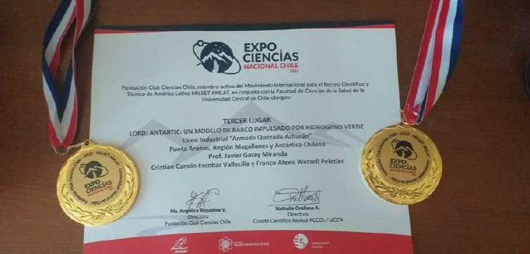 una nueva edición de la ExpoCiencia Chile 2022, un do cente y alumno del Liceo Industrial de Punta Arenas obtuvieron el tercer puesto en una competen cia donde participaron 130 proyectos -de carácter lati noamericana- y se realizó la semana recién pasada en Santiago. Tras estar en el podio los magallánicos presentarán su proyecto de un prototipo de barco que funcione con hidrógeno verde para su navegación por medio