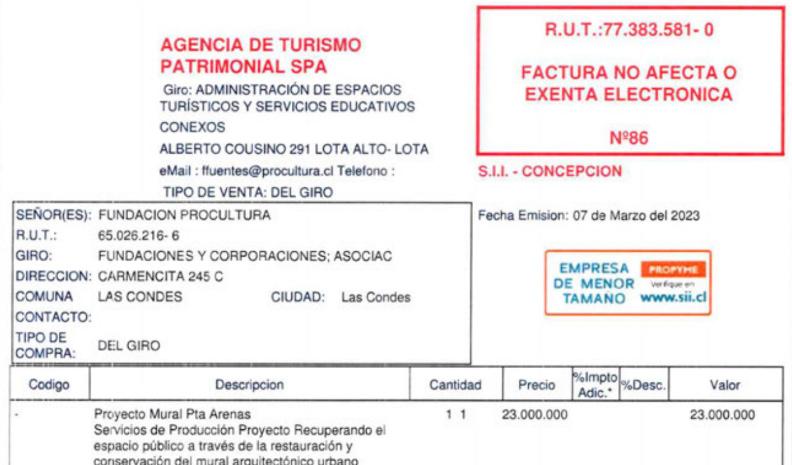 Según indicó en la factura exenta número 86, que se ha conocido, se detalla que “del total de la asignación directa 23 millones 689 mil 999 pesos; un total de 23 millones de pesos fueron directo