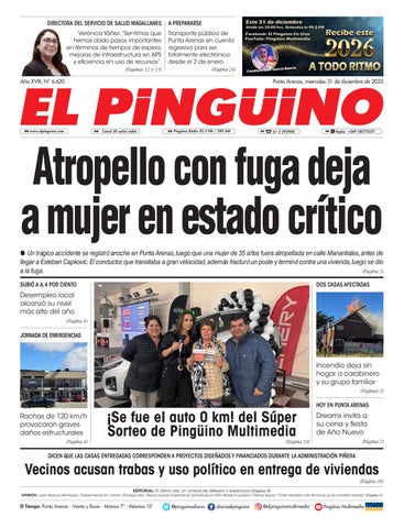 Atropello con fuga deja a mujer en estado crítico ●● Un trágico accidente se registró anoche en Punta Arenas, luego que una mujer de 35 años fuera atropellada en calle Manantiales, antes de llegar a Esteban Capkovic. El conductor, que transitaba a gran velocidad, además fracturó un poste y terminó contra una vivienda, luego se dio (Página 5) a la fuga. SUBió a 6,4 por ciento