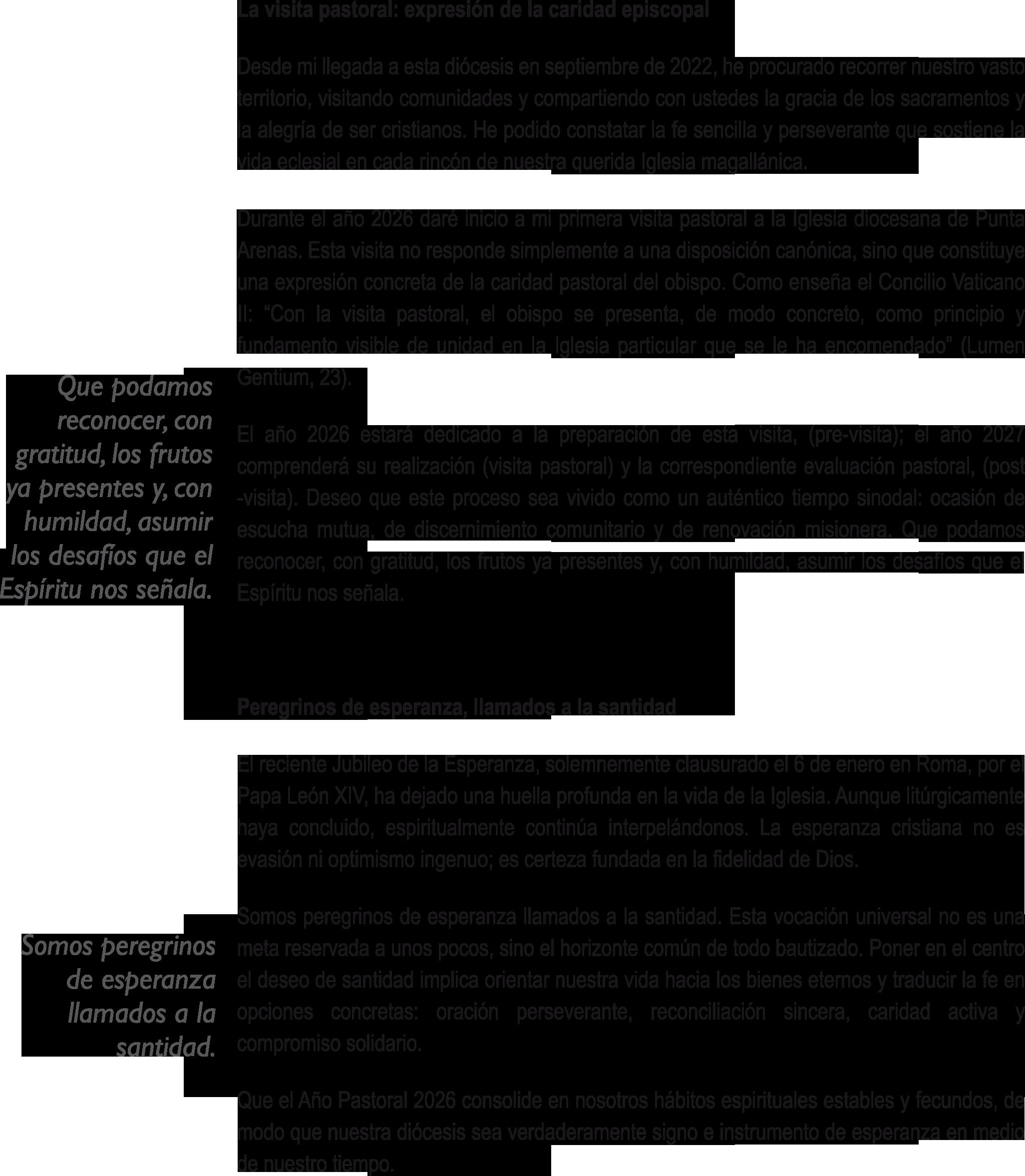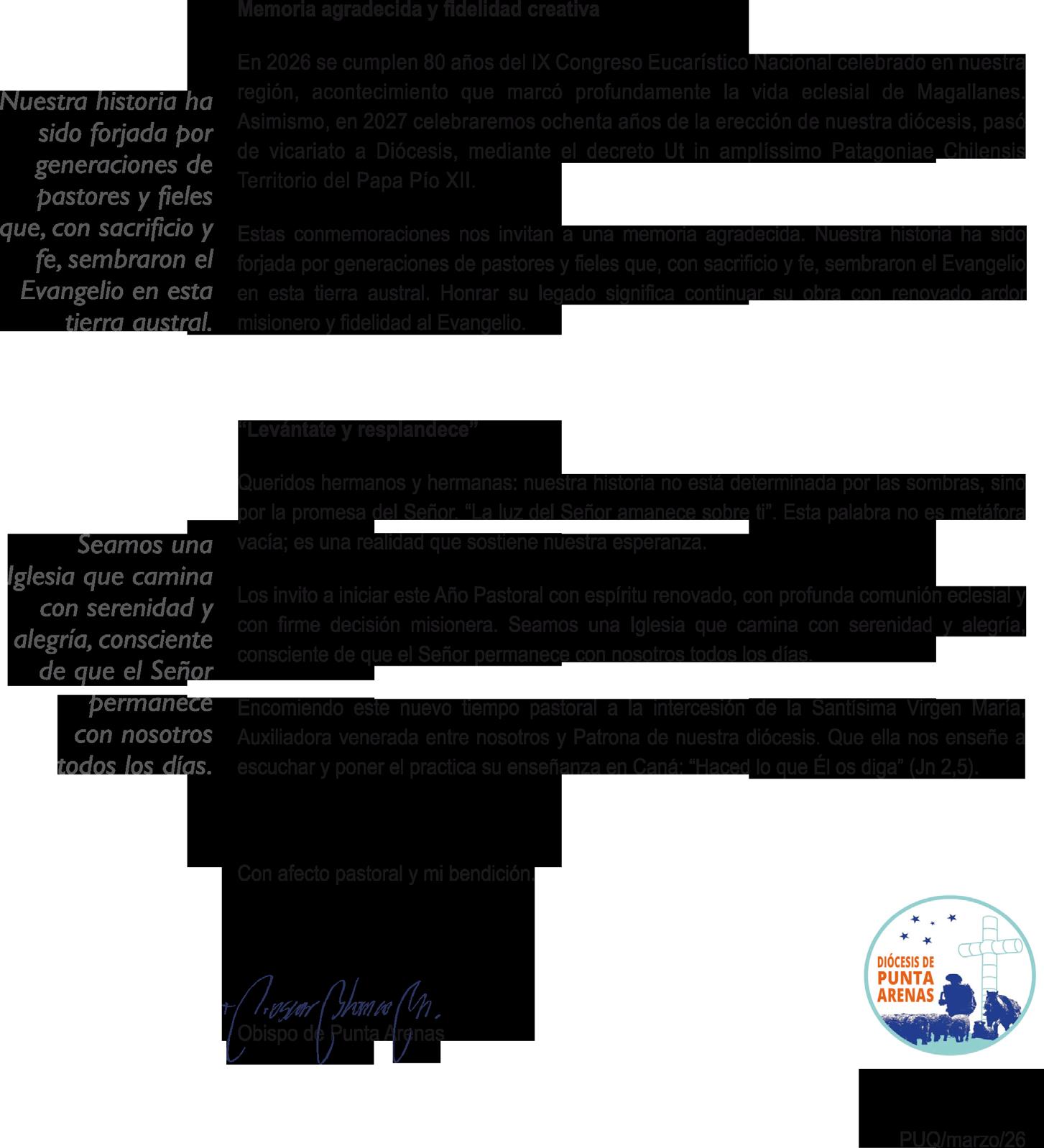 Gracias de corazón, hermanas y hermanos de nuestra querida Iglesia de Magallanes. Con un corazón, henchido de gratitud, dejamos está hermosa tierra, que Dios en su infinito amor nos concedió conocer, y sobre todo, a su gente con su característica propia de acogida y de compartir la vida. Sentimos el dolor de la despedida, pero las muestras de cariño y cercanía fraterna, es bálsamo que suaviza el dolor de decir adiós. Hemos vivido y compartido la fe desde nuestro Carisma franciscanoclareano, con sentido fraterno, dando y dándonos desde nuestra pobreza y debilidad humana, pero lo hemos hecho con mucho amor, orando al Señor y ofreciendo nuestra vida por los hermanos y hermanas que necesitan de fortaleza y consuelo ante el dolor de una enfermedad, o ante situaciones complejas de la vida diaria. Agradecemos al Señor de la Vida, por tantas personas que hemos conocido y con quiénes creamos vínculos de amistad y de fraternidad.