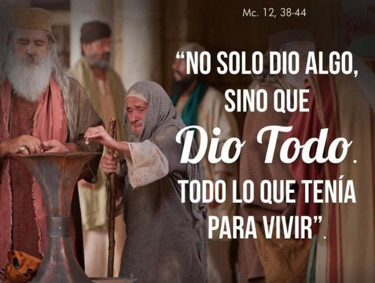Jesús enseñaba a la multitud: «Cuídense de los escribas, a quienes les gusta pasearse con largas vestiduras, ser saludados en las plazas y ocupar los primeros asientos en las sinagogas y los banquetes; que devoran los bienes de las viudas y fingen hacer largas oraciones. Estos serán juzgados con más severidad». Jesús se sentó frente a la sala del tesoro del Templo y miraba cómo la gente depositaba su limosna. Muchos ricos daban en abundancia. Llegó una viuda de condición humilde y colocó dos pequeñas monedas de cobre. Entonces Él llamó a sus discípulos y les dijo: «Les aseguro que esta pobre viuda ha puesto más que cualquiera de los otros, porque todos han dado de lo que les sobraba, pero ella, de su indigencia, dio todo lo que poseía, todo lo que tenía para vivir».