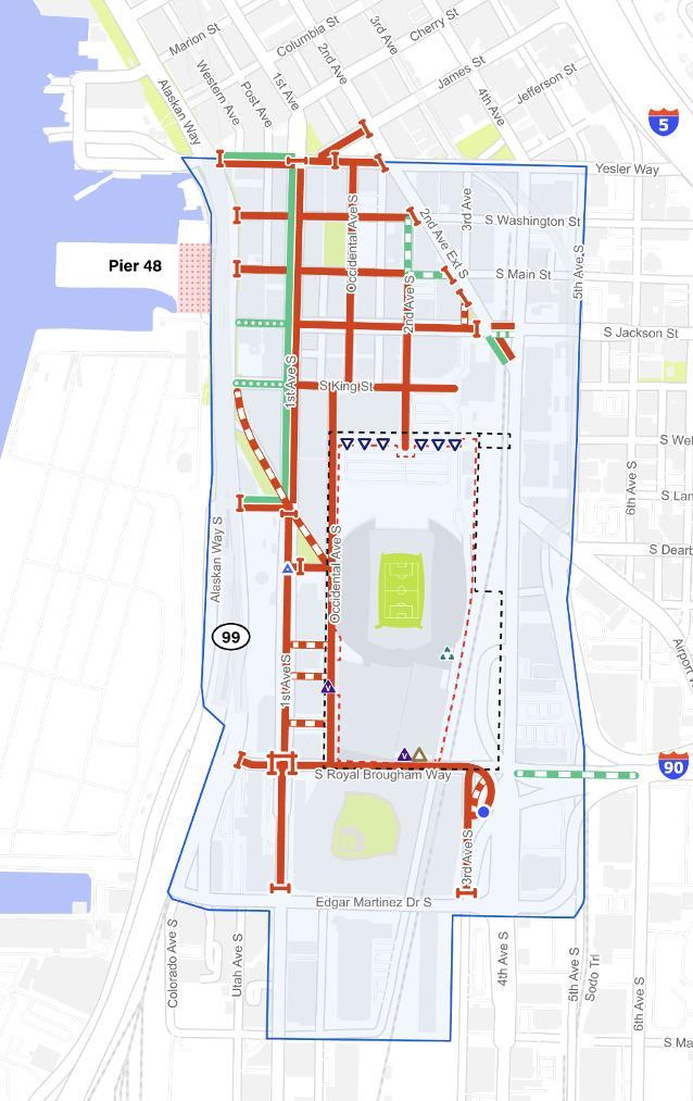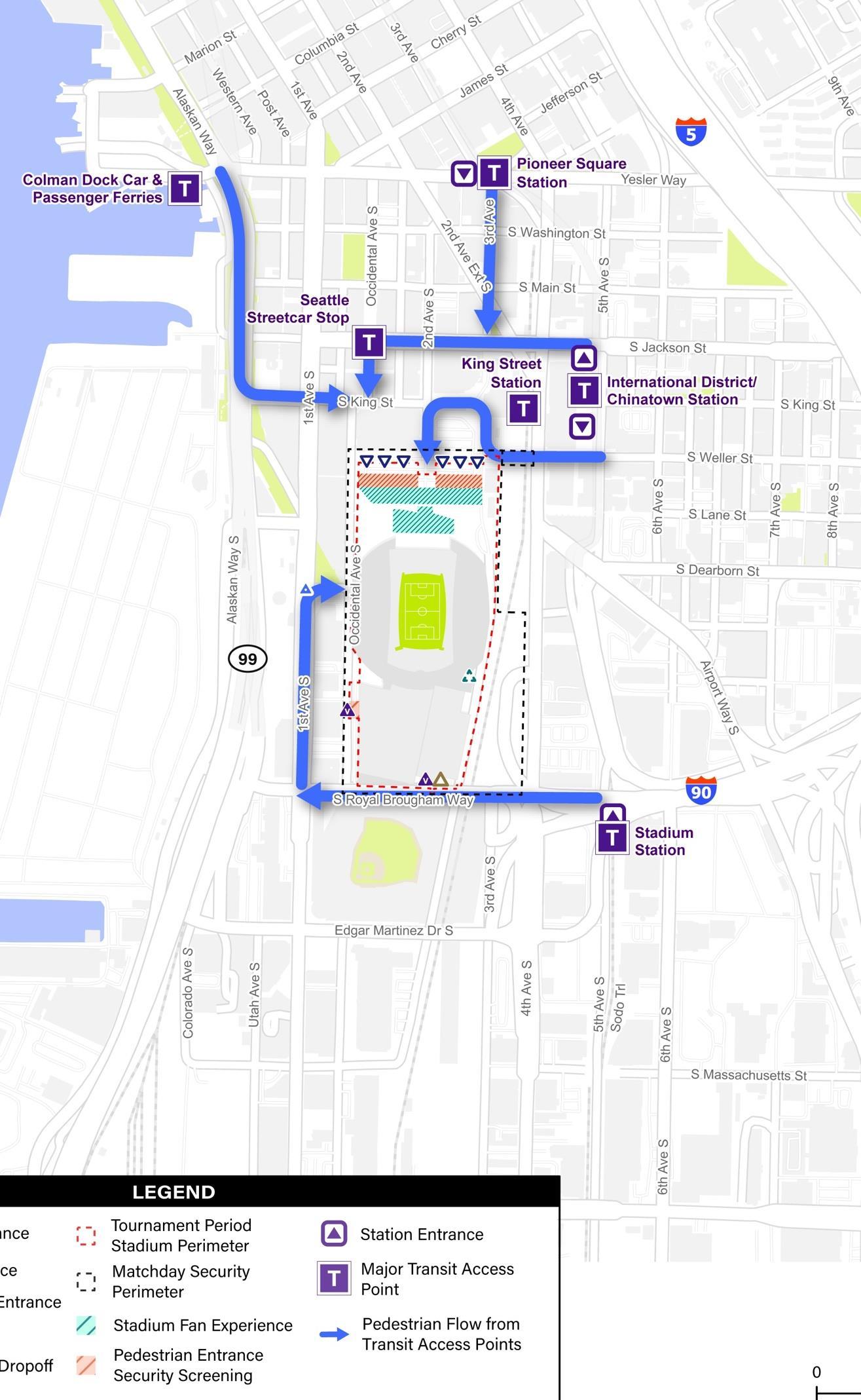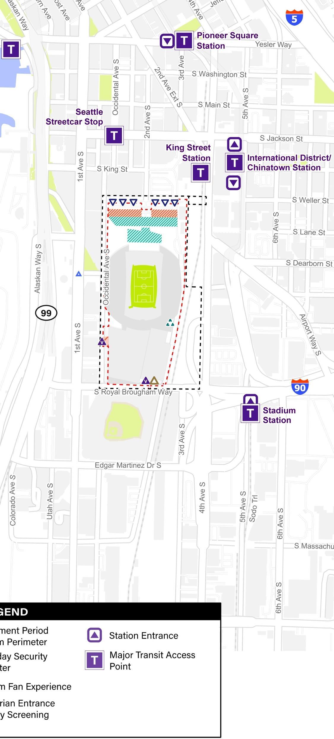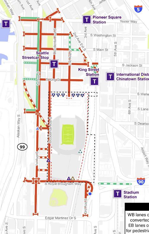 • Royal Brougham Way open for FIFA credentialed vehicles only (between 1st Ave S & 3rd Ave S)