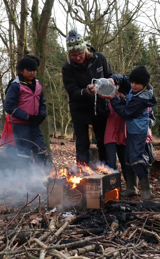 During their Forest School session, they placed the recreation in the firepit and watched as a controlled burn provided a simple yet effective way for the students to witnesss the historical events unfolding. The rapid spread of the flames gave a simple yet tangible experience for them – they even got to be the “fire brigade” and try to put the flames out.