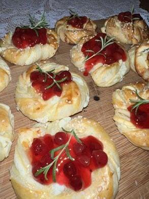 Przygotowanie rozpoczynamy od rozgrzania piekarnika do 180°C. W tym czasie rozwijamy ciasto francuskie na płaskiej powierzchni, najlepiej pozostawiając je na papierze do pieczenia. W osobnej misce łączymy serek śmietankowy z pokruszoną fetą, mieszając składniki do uzyskania jednolitej, kremowej konsystencji. Tak przygotowaną masę serową równomiernie rozsmarowujemy na połowie ciasta francuskiego, a następnie zakrywamy drugą częścią. Kroimy ciasto na paski o grubości około 2 cm. Każdy z nich delikatnie zawijamy, formując niewielkie gniazda i układamy je na blasze wyłożonej papierem do pieczenia. Każde gniazdo smarujemy roztrzepanym jajkiem. Przygotowane zawijasy pieczemy w nagrzanym piekarniku do momentu, aż nabiorą złocistego koloru i staną się chrupiące (około 15 minut). Po upieczeniu dekorujemy je żurawiną oraz świeżym tymiankiem.