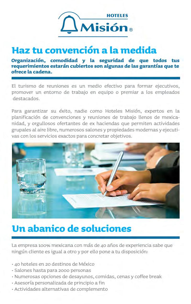 También, además del calendario de eventos programados para el tercer cuatrimestre de este año, ofrecemos contenidos de destinos como Querétaro, Saltillo y Puerto Vallarta, así como de lo que ofrece en diferentes partes de nuestro país, Hoteles Misión, para el segmento de reuniones.
