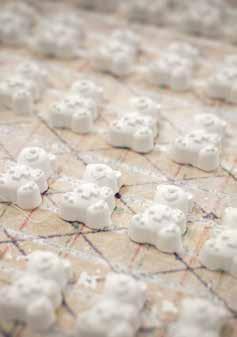 Das Herzstück des Herstellungsprozesses ist die Giessmaschine. Sie produziert die Bärchen –oder Ostergelée – im sogenannten Stärke- oder Pudergussverfahren. Ein Stempelbrett drückt die Formen in die mit Maisstärke gefüllten Rahmen. Die Mulden – je nach Sujet 180 bis 480 pro Brett – werden anschliessend mit der vorbereiteten Masse gefüllt.