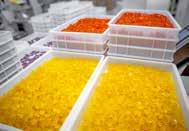Die Gummibärchen gibt es in den vier Geschmacksrichtungen Himbeere, Orange, Zitrone und Cola. Es werden nur natürliche Rohstoffe verwendet. Mit Wasser verdünntes Beerenkonzentrat bringt den fruchtigen Geschmack, Karmin, Carotin und Kurkumaextrakt sorgen für die leuchtenden Farben. Eine Charge wiegt rund 1000 Kilogramm. Die Verwiegestation bereitet die Mengen vor.