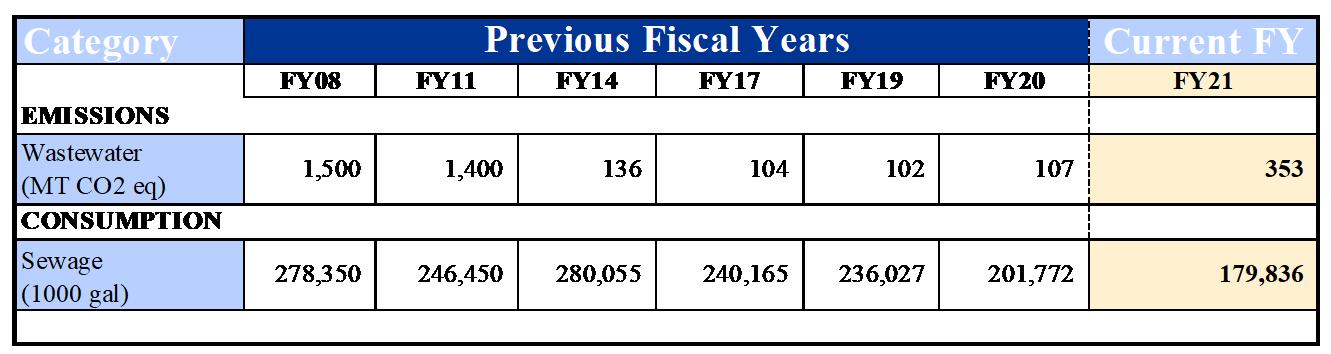 Water & Wastewater: Wastewater represents the 0.22% of FY21 emissions. A recent update in SIMAP emissions factors caused a 230% increase in emissions associated with the wastewater category, despite an 11% decrease in wastewater generation from FY20 to FY21 (21.9 million gallons less in FY21 compared to FY20).