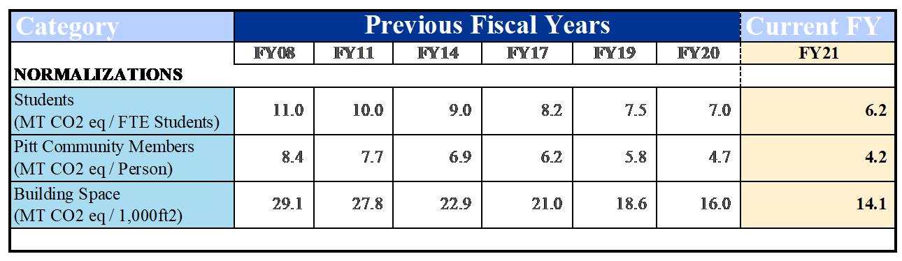Table 20 - Pitt FY21 GHG Emissions Normalized by Students, Total Population, and Building Space 37