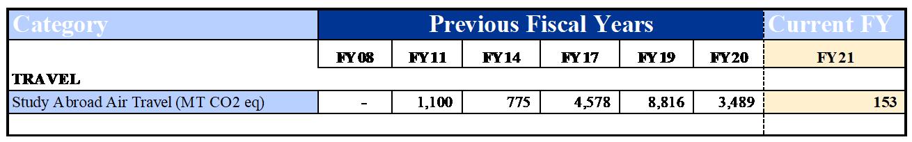 Air Travel: Domestic and international air travel was one of the most affected by the Covid-19 pandemic, which dramatic decreases. Improved data accounting continued in FY21, which allows for more confidence in this category; inclusion of Athletics data must persist.