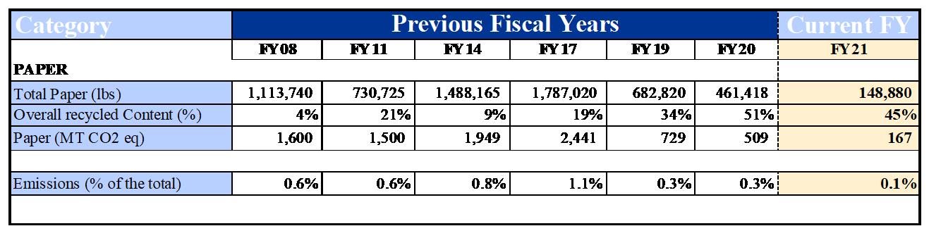 GHG emissions due to paper were down 67% compared to FY20, primarily due to the pandemic forcing an increasing reduction of paper use due to a shift to electronic communication and documentation, paired with an ongoing shift to sourcing more carbon neutral and recycled content paper. Though small overall, this category’s Scope 3 reductions are expected to be more maintainable.