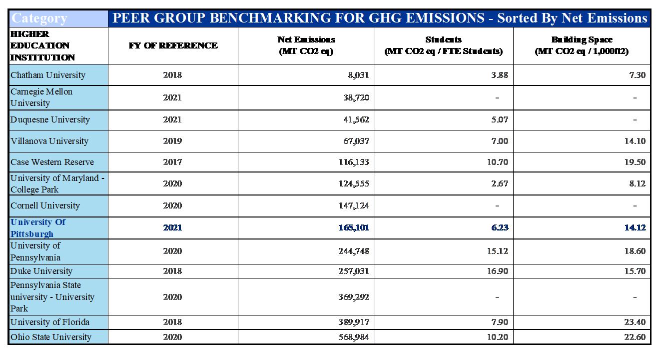 Table 21 shows Pitt’s performance among a group of peer institutions; public university GHG inventories and Second Nature’s reporting tool (University of New Hampshire, 2022a) were referenced for other universities’ normalized performance data.