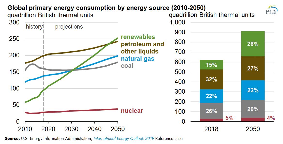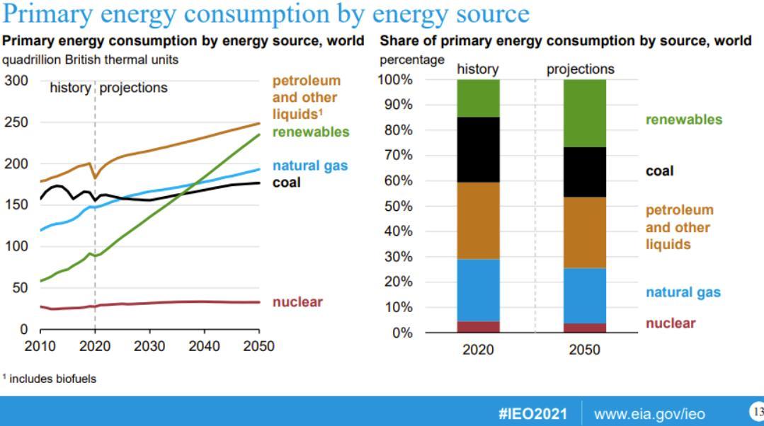 Although the % of energy from Renewables is increasing, the total demand for energy is increasing even faster. Therefore, the need for natural gas & oil is projected to continue to slowly grow over the next 3+ decades.