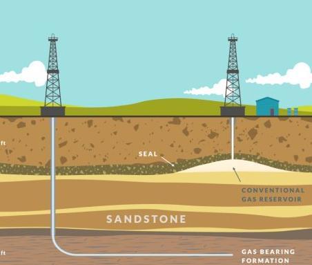 Geology (using geology to understand the nature of natural gas and oil that occur in various types of underground layers of rock such as conventional formations of sandstone and carbonates with pores so big that the fluids can flow through them, and unconventional formations such as shale with pores so small that fluids must diffuse into and out of them