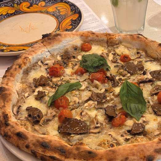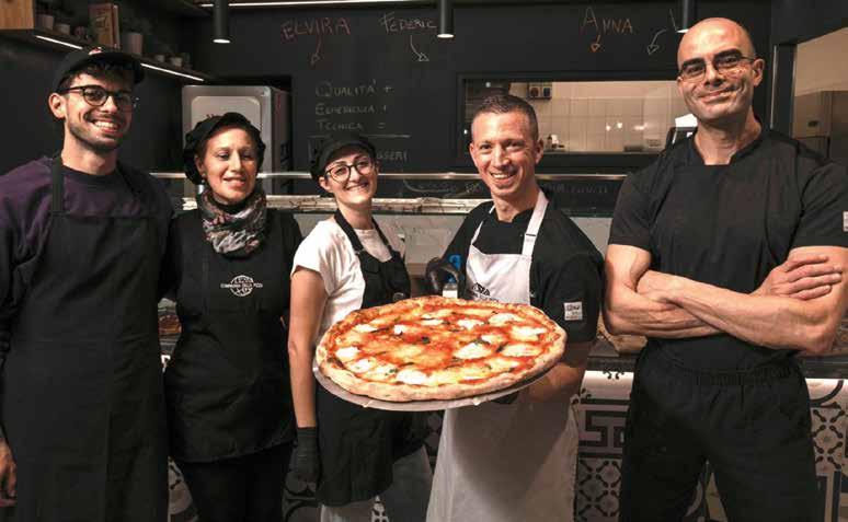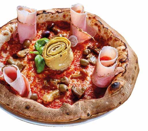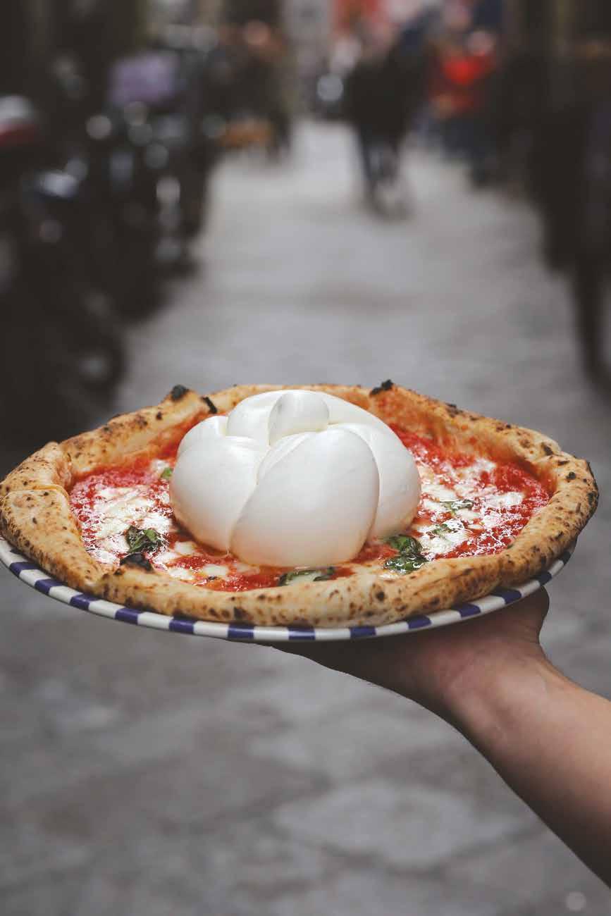 Da “Cambia.menti”, il locale di Ciccio Vitiello, si può assaggiare “Orto”, con fior di latte, crema di broccolo barese, friarielli, scarola ripassata con uvetta e pinoli, salsa di papaccella, bietola multicolore e polvere di olive, oppure la “Uova & Patate”, con patate cotte al burro, crema di tuorlo d’uovo e pecorino, guanciale ed erba cipollina. Giovanni Santarpia, a Firenze, ha in carta una “Vegetariana” con crema di friarielli, fior di latte “Fior d’Agerola”, patate al forno, pesto di pomodorini secchi, pecorino toscano, olive nere mentre Lello Ravagnan di “Grigoris”, oltre alla “Joselito e Nocciola Fiordilatte di Agerola”, con joselito paleta, burrata pugliese, crema di nocciole e mascarpone di malga e cacioricotta, firma due pizze vegane di eccezione: la “Meravigliosa”, con crema di ceci, misticanza, tartare di verdure, semi misti, la “Tutto Bosco”, con sbrise, verza al forno, champignon in crema, noci tostate.
