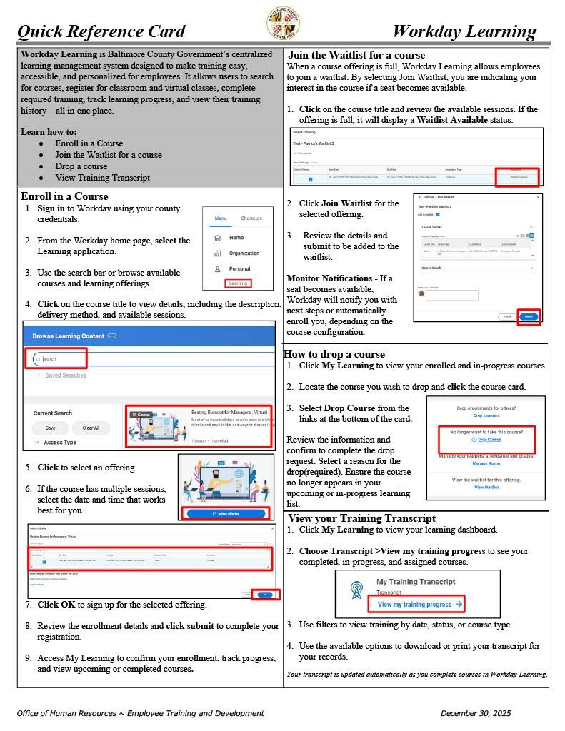 Course Dates and Times may be found at https://baltcomd.sharepoint.com/ sites/BCPoint/Training or Workday Learning. Contact your Department Training Liaison or email us at employeetraining@baltimorecountymd.gov for assistance.