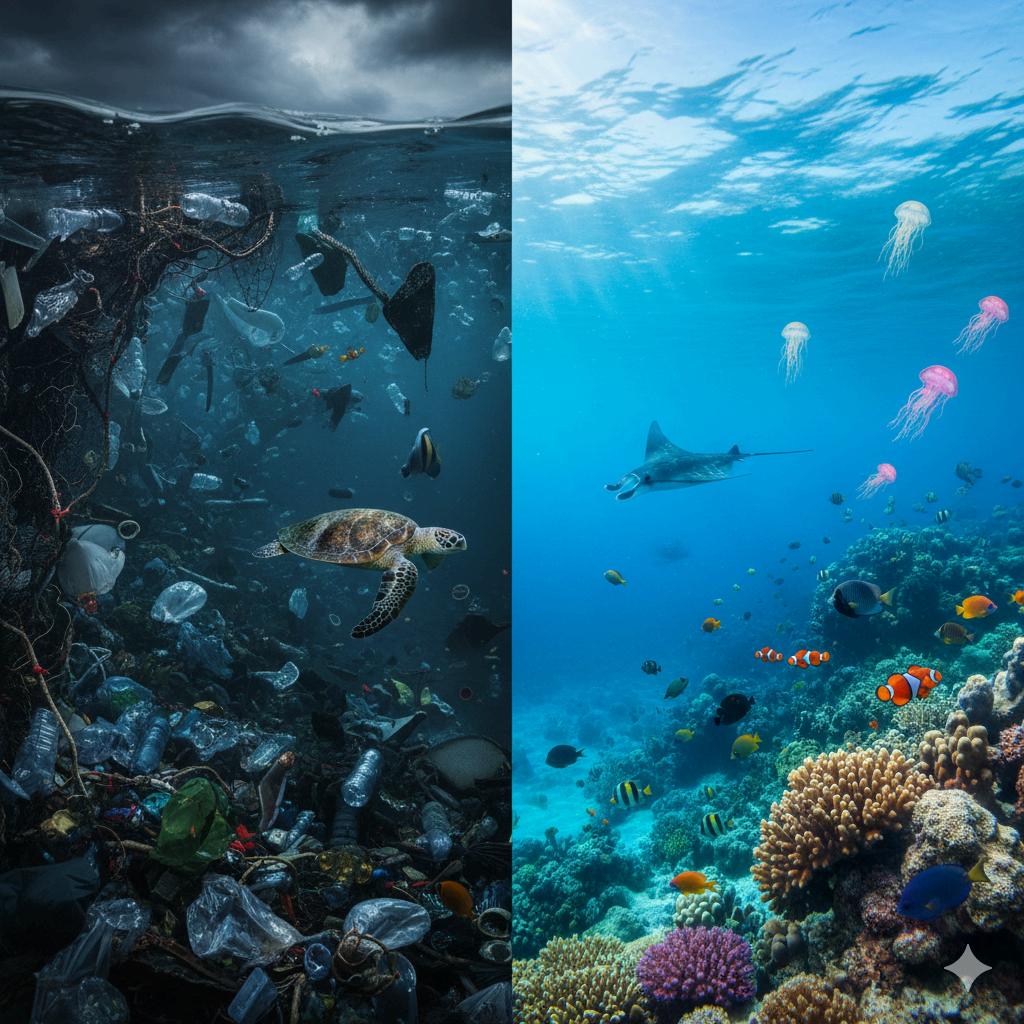 Cut single-use plastic and choose reusable alternatives. Benefits: Protects marine life and ecosystems. Lowers carbon footprint and saves energy.