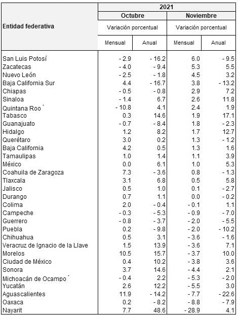 De acuerdo con información proporcionada por el Instituto Nacional de Estadística y Geografía (Inegi), estas cifras corresponden a noviembre de 2021 y con cifras ajustadas estacionalmente , a tasa mensual.